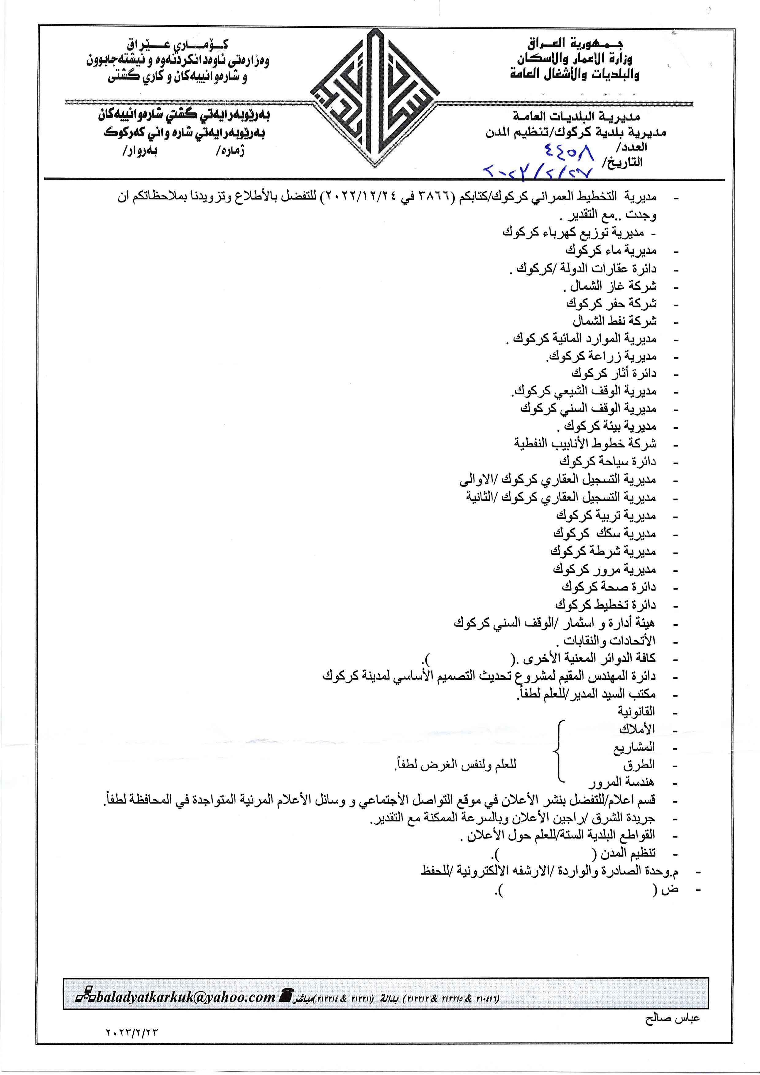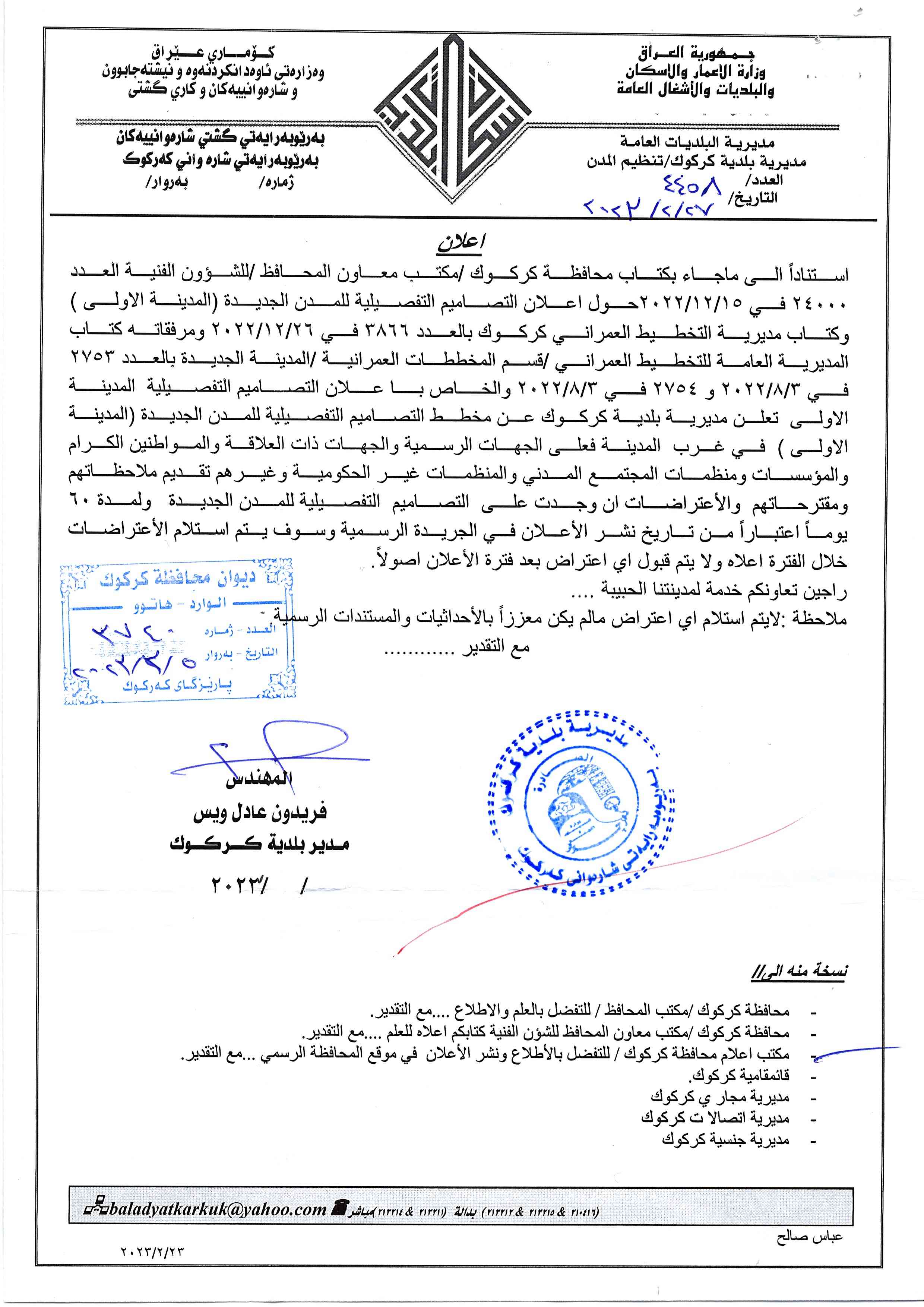 استناداً الى ماجاء بكتاب محافظة كركوك مكتب معاون المحافظ للشؤون الفنية العدد ٢٤٠٠٠ في ۲۰۲۲/۱۲/۱٥ حول اعلان التصاميم التفصيلية للمدن الجديدة (المدينة الاولى ) وكتاب مديرية التخطيط العمراني كركوك بالعدد ٣٨٦٦ في ۲۰۲۲/۱۲/۲٦ ومرفقاته كتاب المديرية العامة للتخطيط العمراني قسم المخططات العمرانية /المدينة الجديدة بالعدد ٢٧٥٣ في ۲۰٢٢/٨/٣ و ۲۷٥٤ في ۲۰۲۲/۸/۳ والخاص با علان التصاميم التفصيلية المدينة الاولى