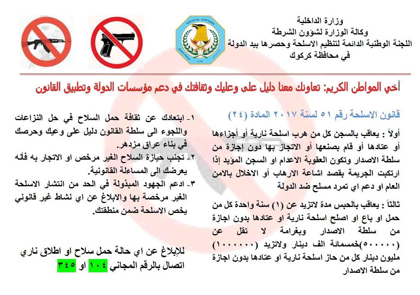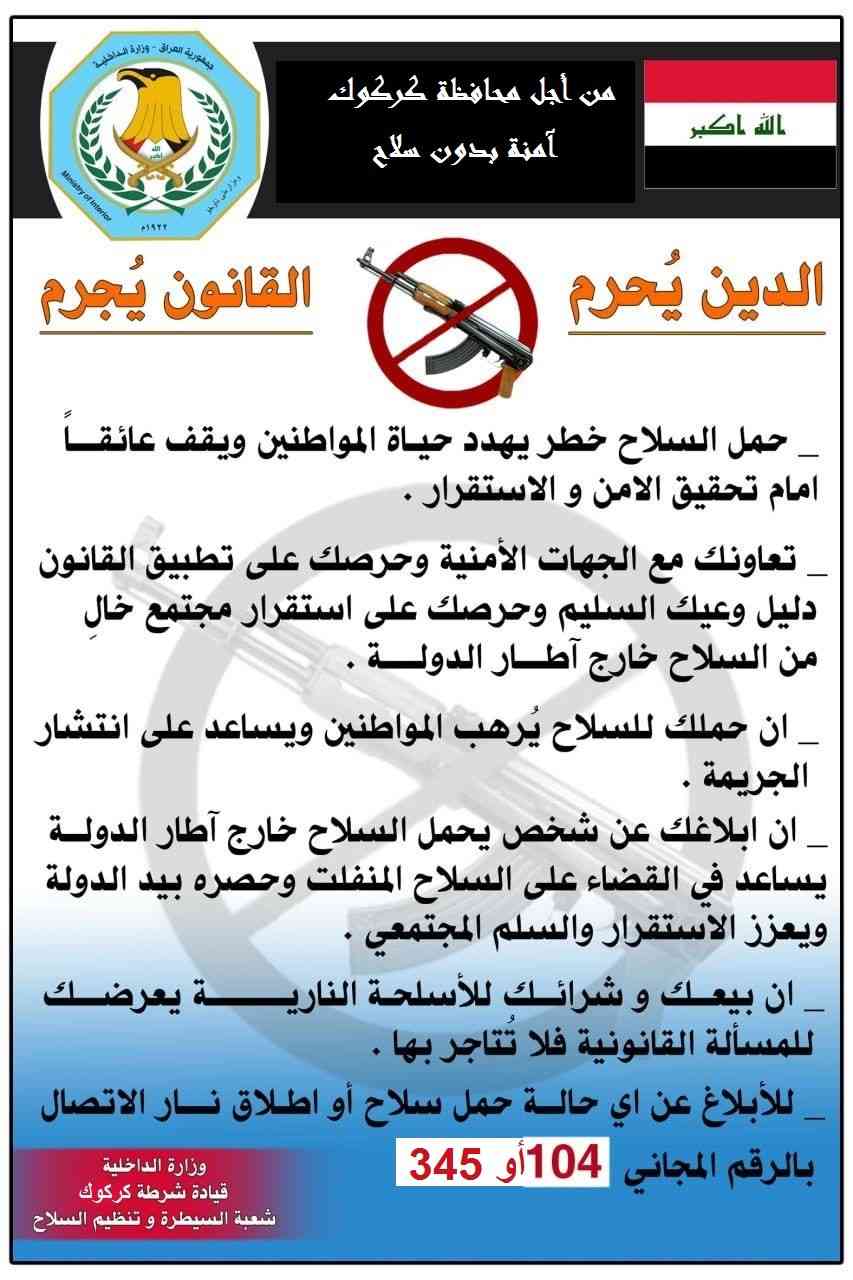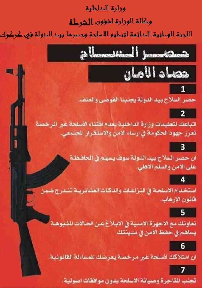 ادناه مجموعة من دلالات و ارشادات توعوية هادفة لمخاطر الاسلحة الغير مرخصة على المجتمع الصادرة من وزارة الداخلية / اللجنة الوطنية الدائمة لتنظيم الاسلحة و حصرها بيد الدولة ، و ضمان أمن و سلامة المجتمع و تعزيز السلم الاهلي .