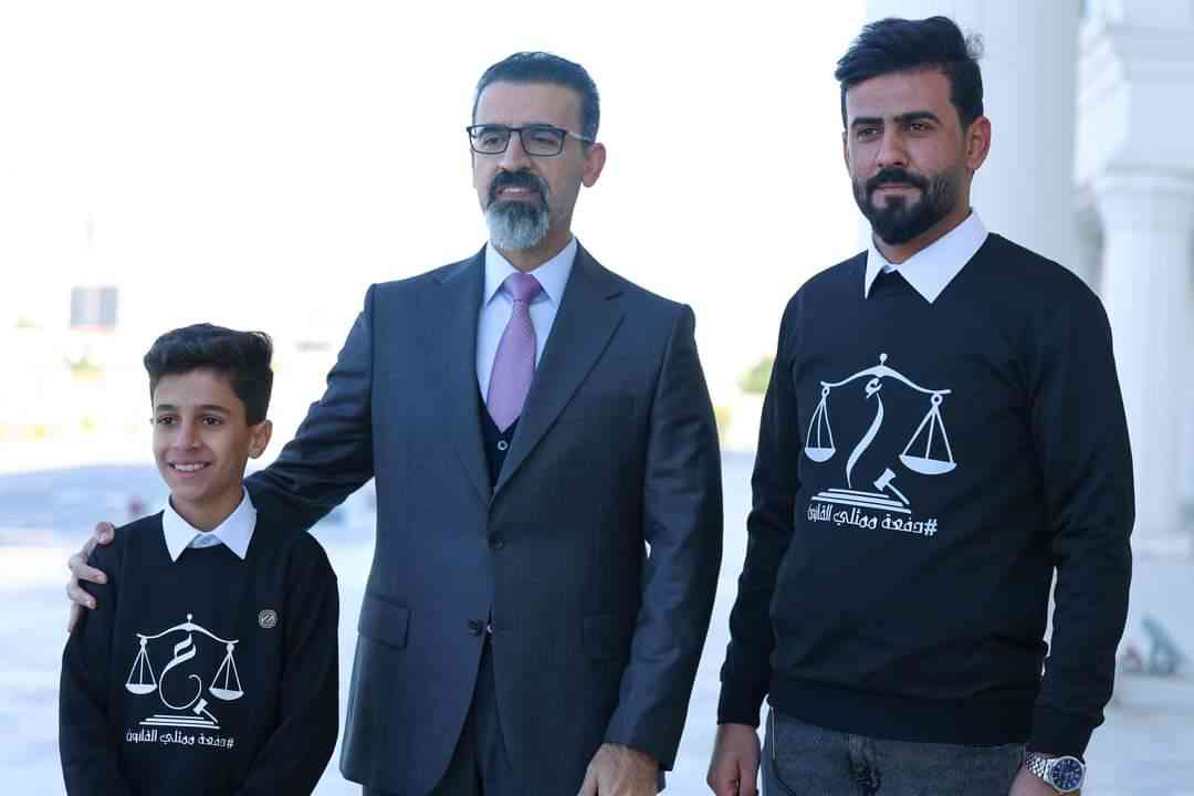 stands with a number of graduates of the College of Law at the University of Kirkuk and their families in front of the governorate building.