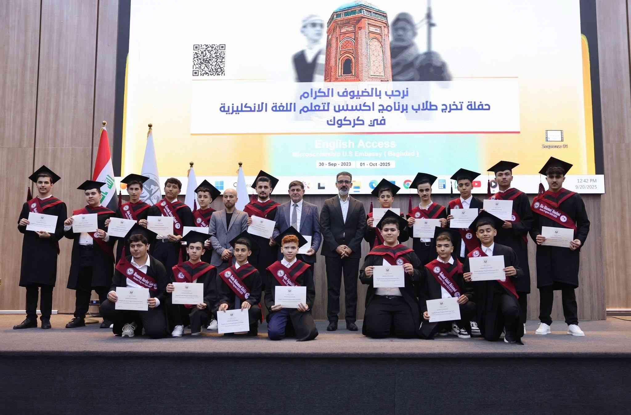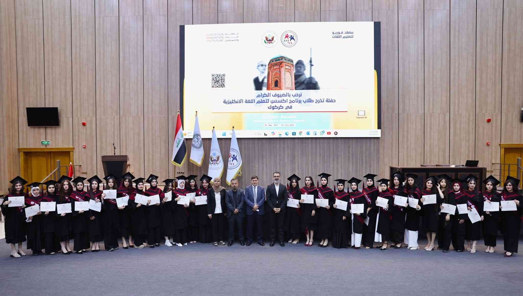 حفل تخرّج طلاب برنامج اكسس لتعلم اللغة الإنكليزية في كركوك والذي دعمته السفارة الاميركية في العراق مع منظمة من اجلك للتنمية البشرية ومعهد فوريو لتعليم اللغات