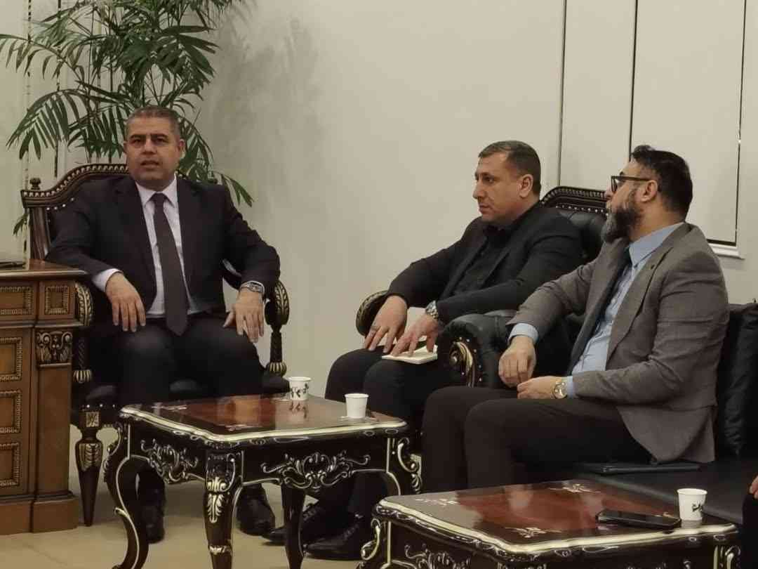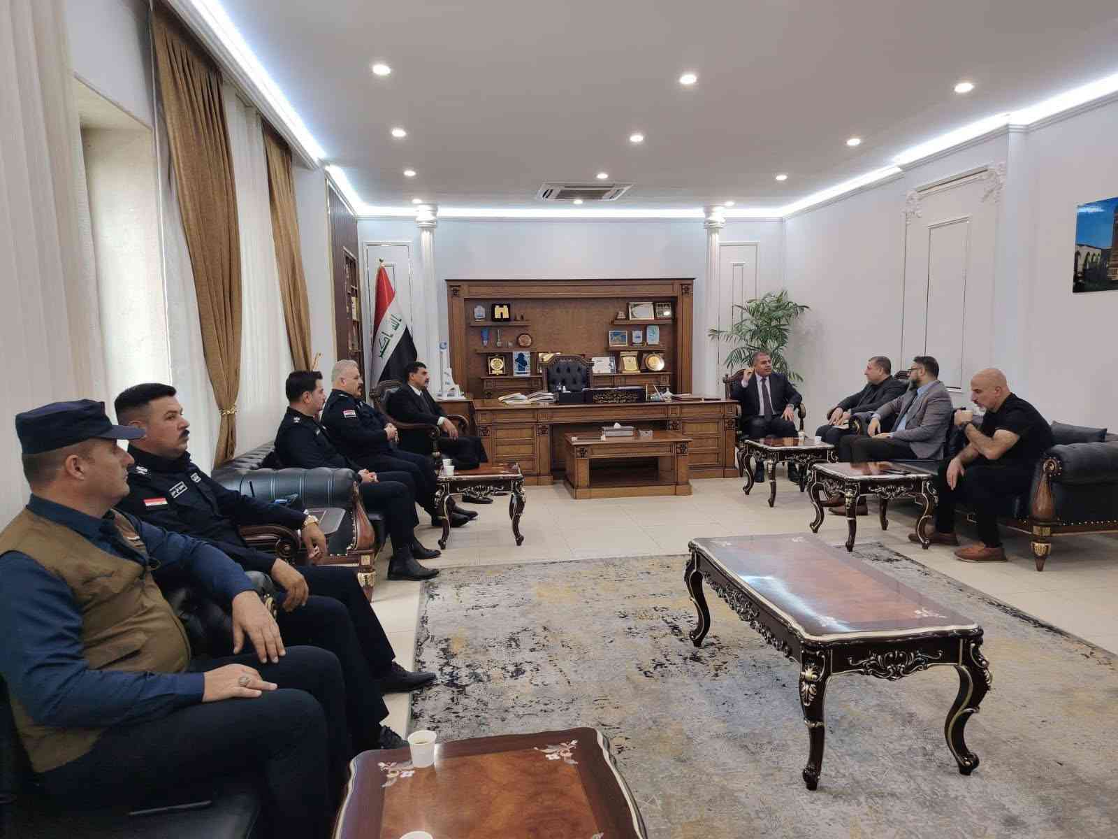 The First Deputy Governor of Kirkuk, Dr. Yawuz Hamid Mahmoud, received the District Commissioner (Qaimaqam) of Daquq District, Dr. Siraj Al-Din Nazim, along with the Director of Tribal Affairs and the Director of Community Policing.