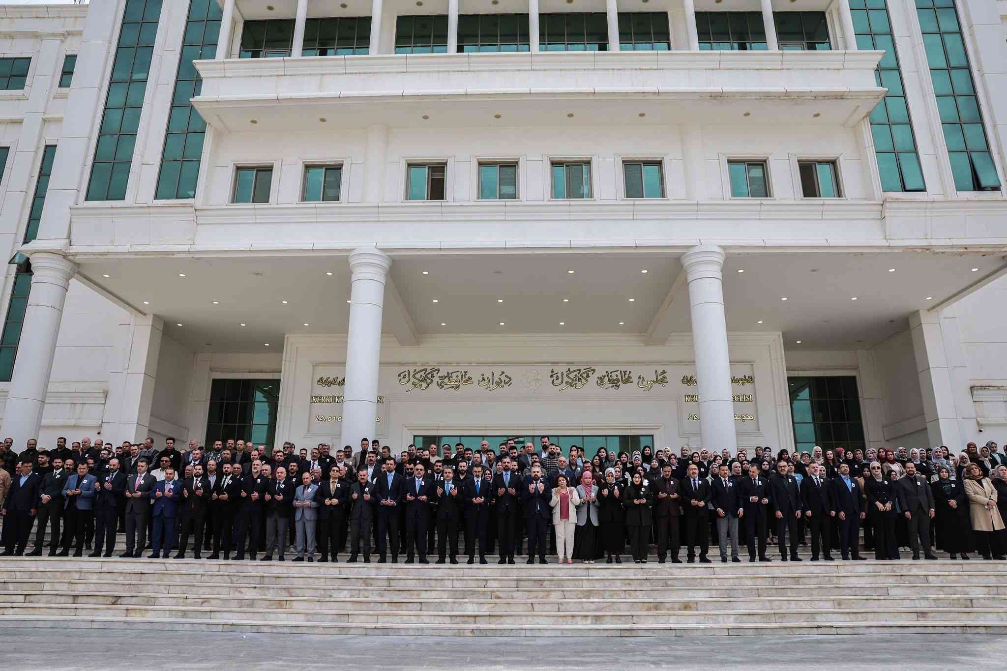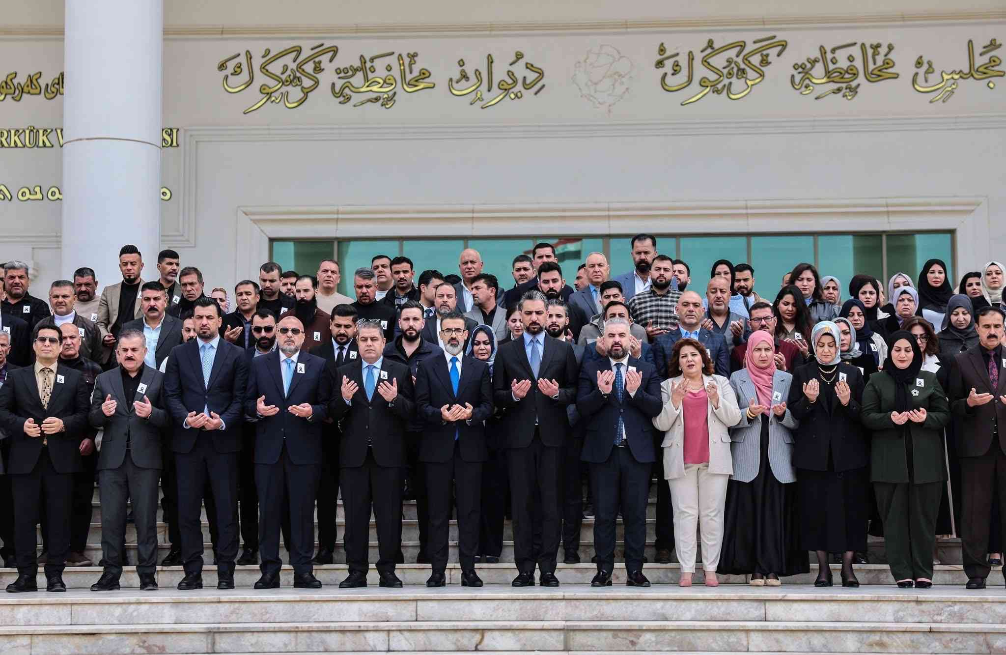 The Governor of Kirkuk, Rebwar Taha Mustafa, along with the Chairman of the Provincial Council, Eng. Mohammed Ibrahim Al-Hafidh, the First Deputy Governor, Dr. Yawuz Hamid, a number of members of the Provincial Council, assistants, department directors, and staff of the Governorate and Council, participated in the memorial gathering held at the Governorate building to commemorate the thirty-fifth anniversary of the Tuz Khurmatu and Taza Massacre, where Surah Al-Fatiha was recited in tribute to the martyrs.