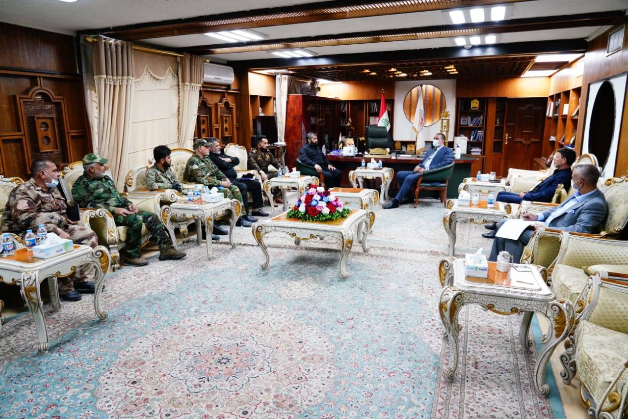 بحث السيد محافظ كركوك راكان سعيد الجبوري رئيس اللجنة الأمنية العليا , مع قائد فرقة العباس القتالية الشيخ ميثم الزيدي الأوضاع الأمنية وجهود تعزيز الاستقرار في عموم كركوك , في ظل التقدم بتنفيذ المشاريع الخدمية ودعم جهود الاستقرار وعودة النازحين . وقال سيادته خلال اللقاء الذي عقد بمكتبه الرسمي , بحضور وفدا من فرقة العباس القتالية والعتبة العباسية وبمشاركة السيد احمد كهيه مسؤول المواكب في كركوك . اننا نعبر عن اعتزازنا بتضحيات القوات الأمنية البطلة خاصة فرقة العباس القتالية التي قدمت التضحيات في عمليات تحرير مناطق جنوب كركوك وغربها وقصبة بشير ..مؤكدا اننا نعتز بقيادة الفرقة وابطالها وجميع قواتنا بمختلف صنوفها التي كانت عنوان للتضحية والسلام والتعايش وبناء الثقة بين المواطن وقواتنا الامنية ,وجهود العتبه العباسية والمراجع الدينية في دعم جهود مواجهة فيروس كورونا وبناء مراكز للعزل الوبائي . واشار ان نعبر عن اعتزازنا بتضحيات اهلنا في بشير التي سعينا وعملينا لاعمارها مع ناحية تازه وترون مدى التقدم في خدماتها ونؤكد اهمية التعايش والعمل مع الجميع بما يحقق السلم والأمن ويسهم في القضاء على فلول داعش . واكد اننا بفخر ساهمنا وعملنا على بناء الثقه وتعزيز الدعم والتعاون والعمل بروح الفريق الواحد وتلبية متطلبات قواتنا لتؤدي مهامها الوطنية . واكد الشيخ الزيدي , ان زيارتهم لكركوك جاءت بهدف التنسيق والتعاون وخدمة مواطنيها ودعم ادارتها التي تبذل الجهود في اعمار المحافظة بشكل كبير ومساندة القوات الامنية .